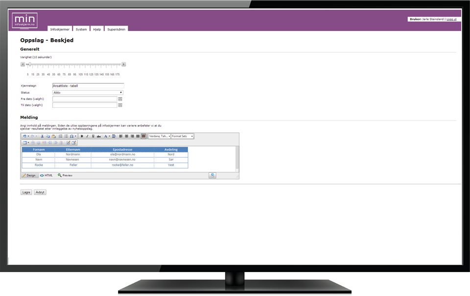 Dersom man ønsker å tilpasse innholdet som skal vises, kan den avanserte bruker selv skrive HTML-koden som skal vises på infoskjermen. Man velger da «HTML- kode» i valget for kilde, og man får da opp en tekstboks man kan skrive inn koden i.